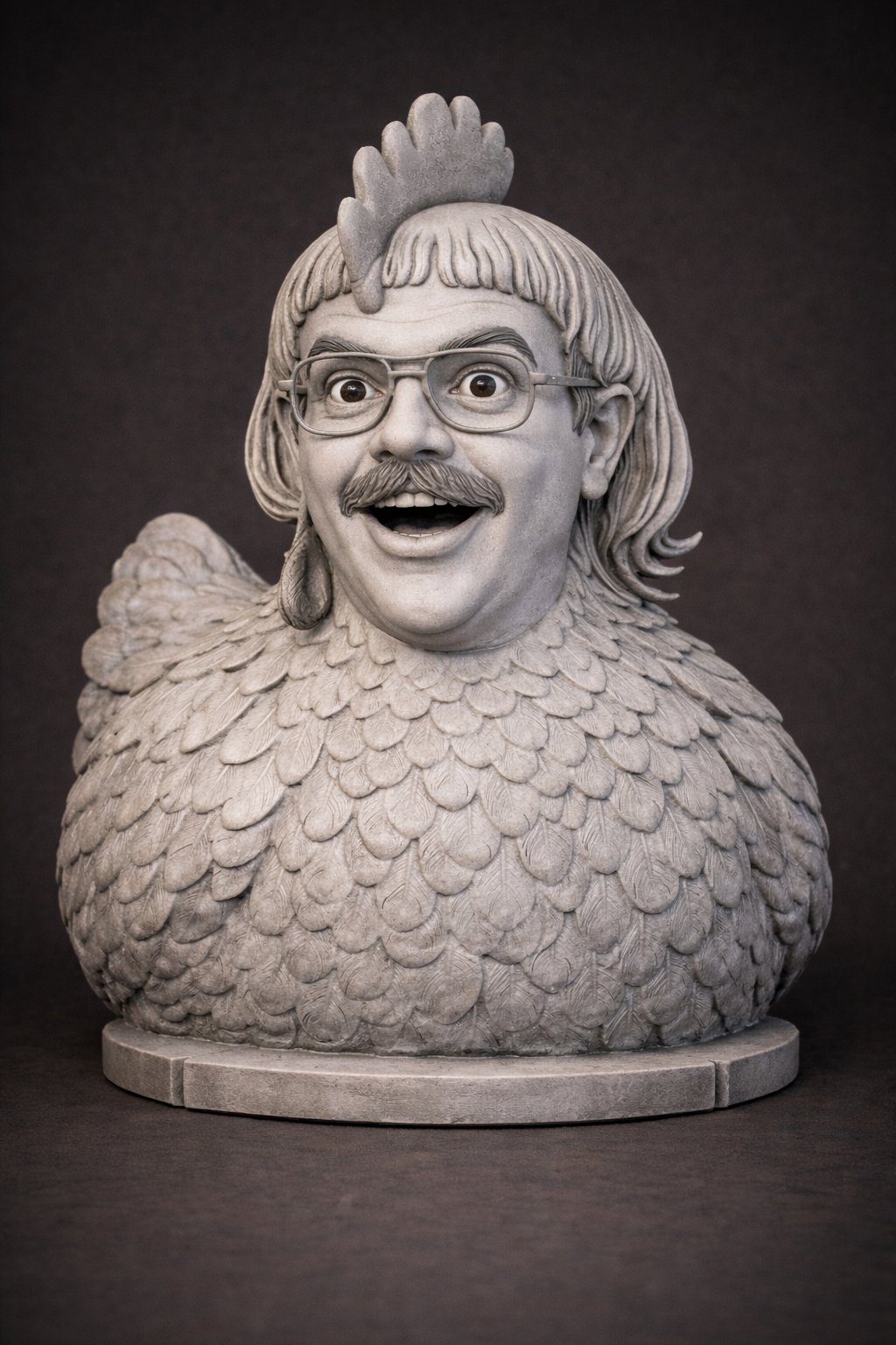 A 3D printed plastic play on words. The characters name is Chit. So naturally i made him into, "Chicken Chit". Jay Renshaw, known as "Chit" on TikTok, is an actor and creator famous for his comedic character sketches, often focusing on awkward office or social scenarios, frequently featuring in the "Chit Show" content. His character has gained viral popularity for its relatable and humorous take on workplace dynamics, often with a "duality" of being both incompetent and strangely capable, which has resonated widely on the platform. The size is approximately 6"x6". It is made with PLA extruded from a 3D printer. This is MY creation and one of a kind.